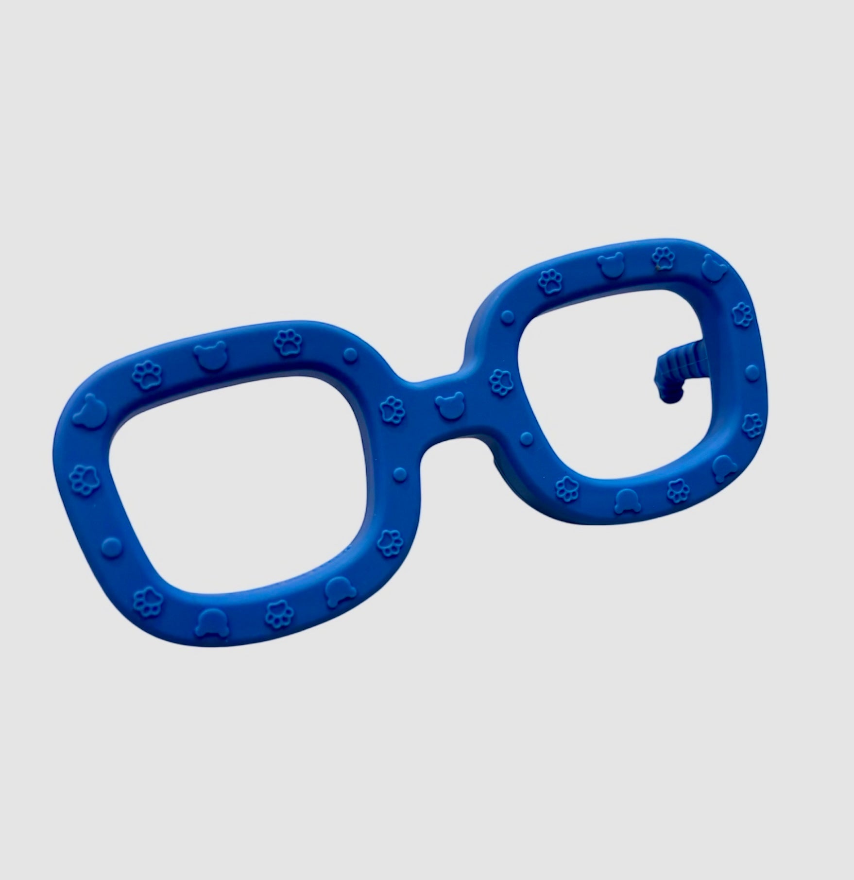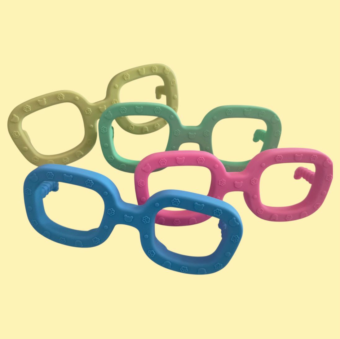 silicone teether shaped like a pair of glasses, making it easy for babies to